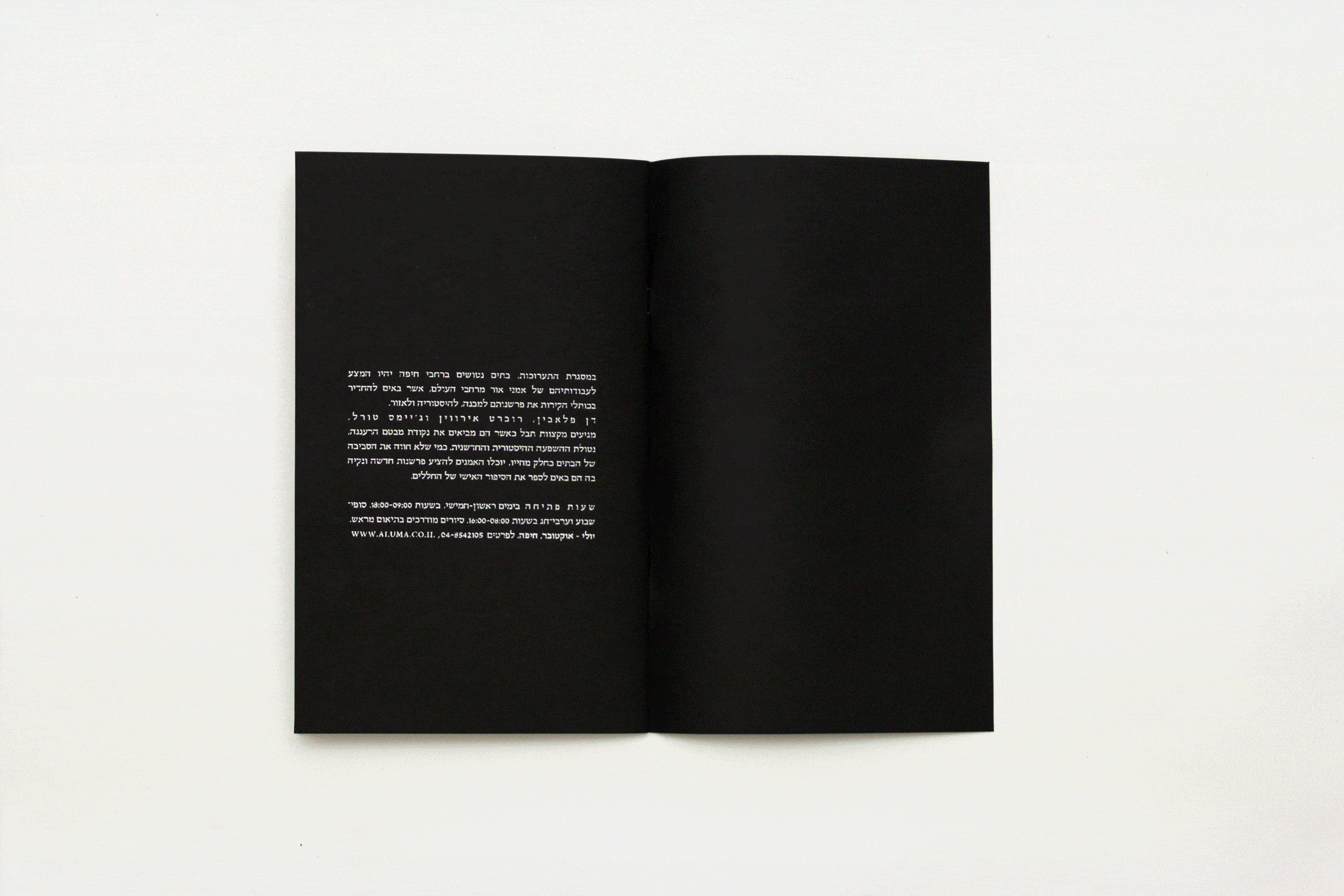 <h-300>“Aluma”<h-300>(the Hebrew word for light beam) is a visual identity project for light and space art movement exhibition taking place in several <italic>abandoned<italic> buildings and spaces in Downtown Haifa. The idea that guided the design was the doctrine of <italic>present-absentees<italic> (“Nokhehim Nifkadim” in Hebrew) which known from the Israel independence war, 1947–49, once the Arabs who owned those buildings deserted or deported their homes and belongings, and left the Israeli territory.